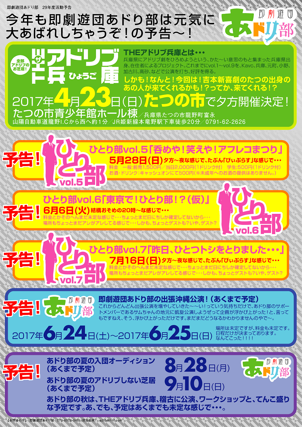 昨年はとにかく数多くの公演を打ち、各地でアドリブ劇を広めてきました。 並行して夏と冬には新人オーディションを行い、後進育成にもチカラを入れてきました。 第二回新人発表会では、その新人達が日々の稽古の成果を発揮する場所となります!ドキドキとワクワクの70分!!新人のみなぎるパワーで爆笑の空間にしてみせます!